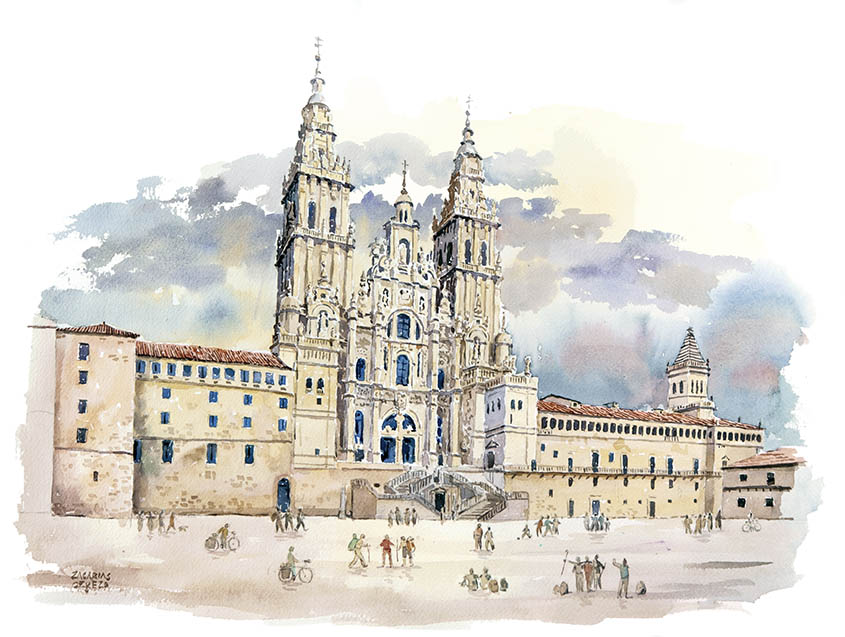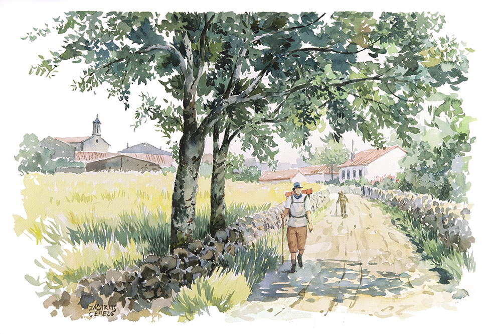 En nuestra Acuarela de viaje dedicada al Camino de Santiago, Zacarías Cerezo ha logrado trasladar, desde la rauda composición que permite esta, para mí, tan difícil técnica de la acuarela, el alma imperecedera de la ruta. Lo ha conseguido tanto a través de la estática de sus monumentos, en la solidez del gran edificio y la humildad de la arquitectura popular, como en la dinámica de los paisajes con figurantes del presente, unos protagonistas que somos, ni más ni menos, que nosotros mismos, los peregrinos.